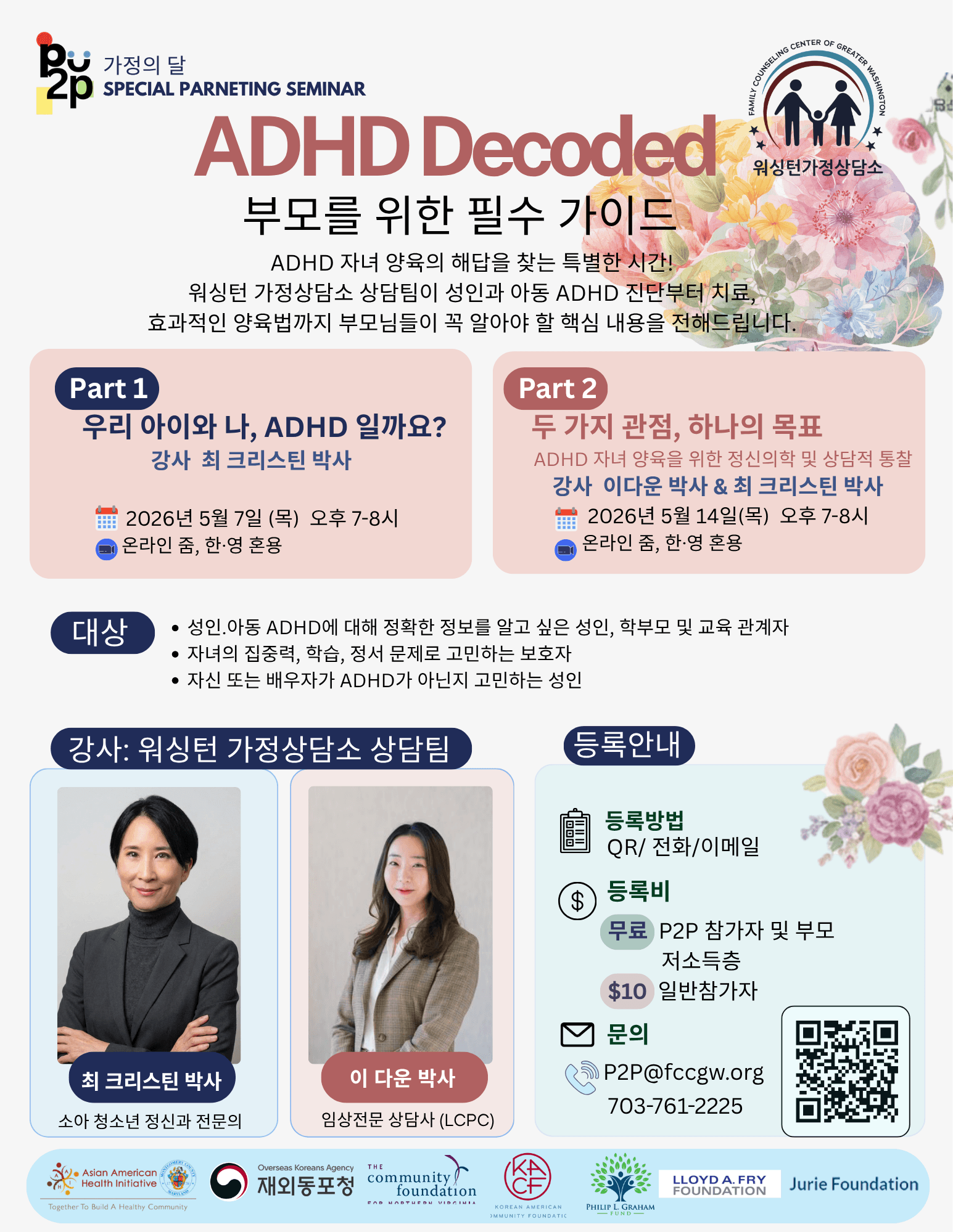 워싱턴 가정상담소 상담팀이 성인과 아동 ADHD 진단부터 치료, 효과적인 양육법까지 부모님들이 꼭 알아야 할 핵심 내용을 전해드립니다.