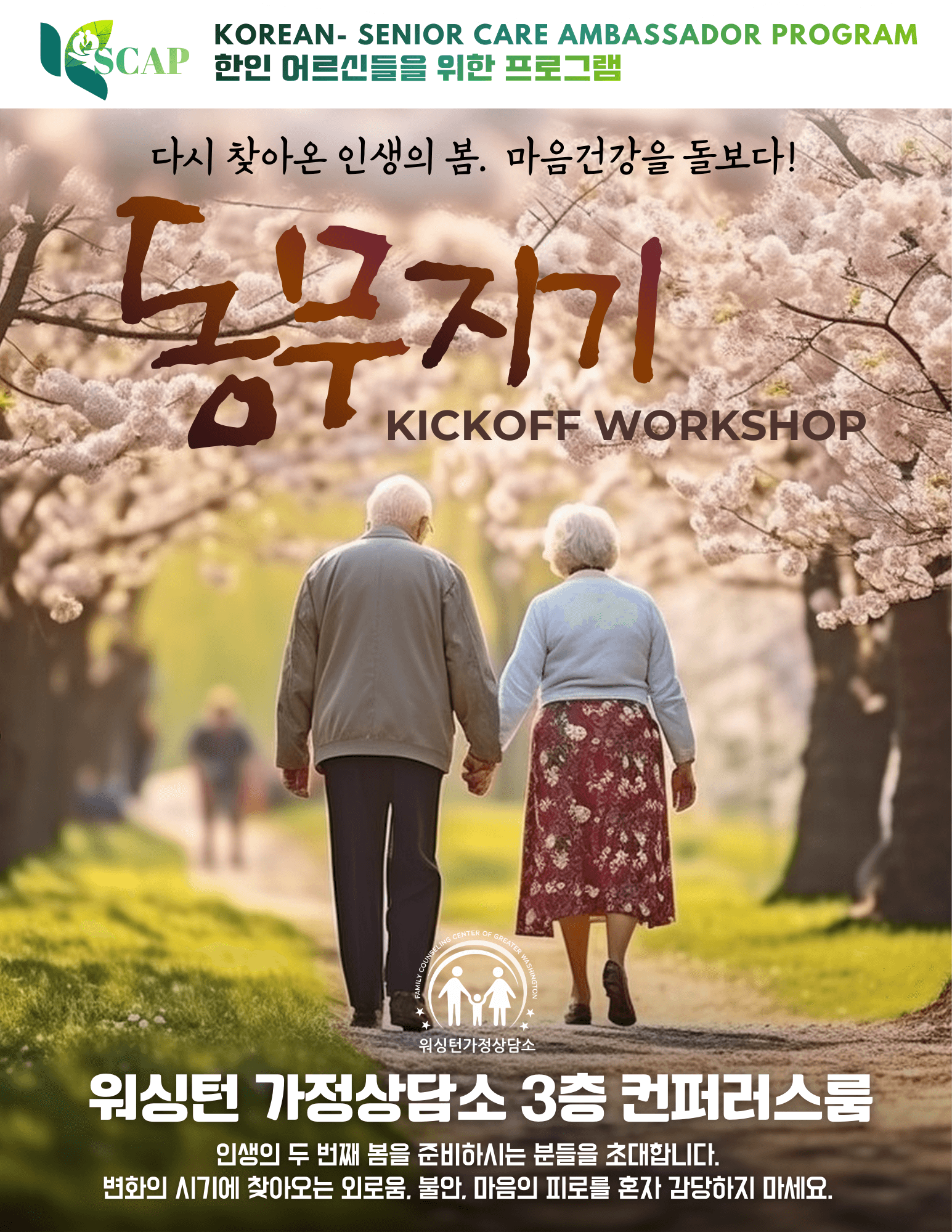 The K-SCAP is a peer-driven mental health care program designed for Korean seniors. Certified senior care providers, known as SCAPers, offer emotional support to other seniors through various community outlets. K-SCAP training is a six weeks course offered by a licensed professional counselor and a marriage therapist.